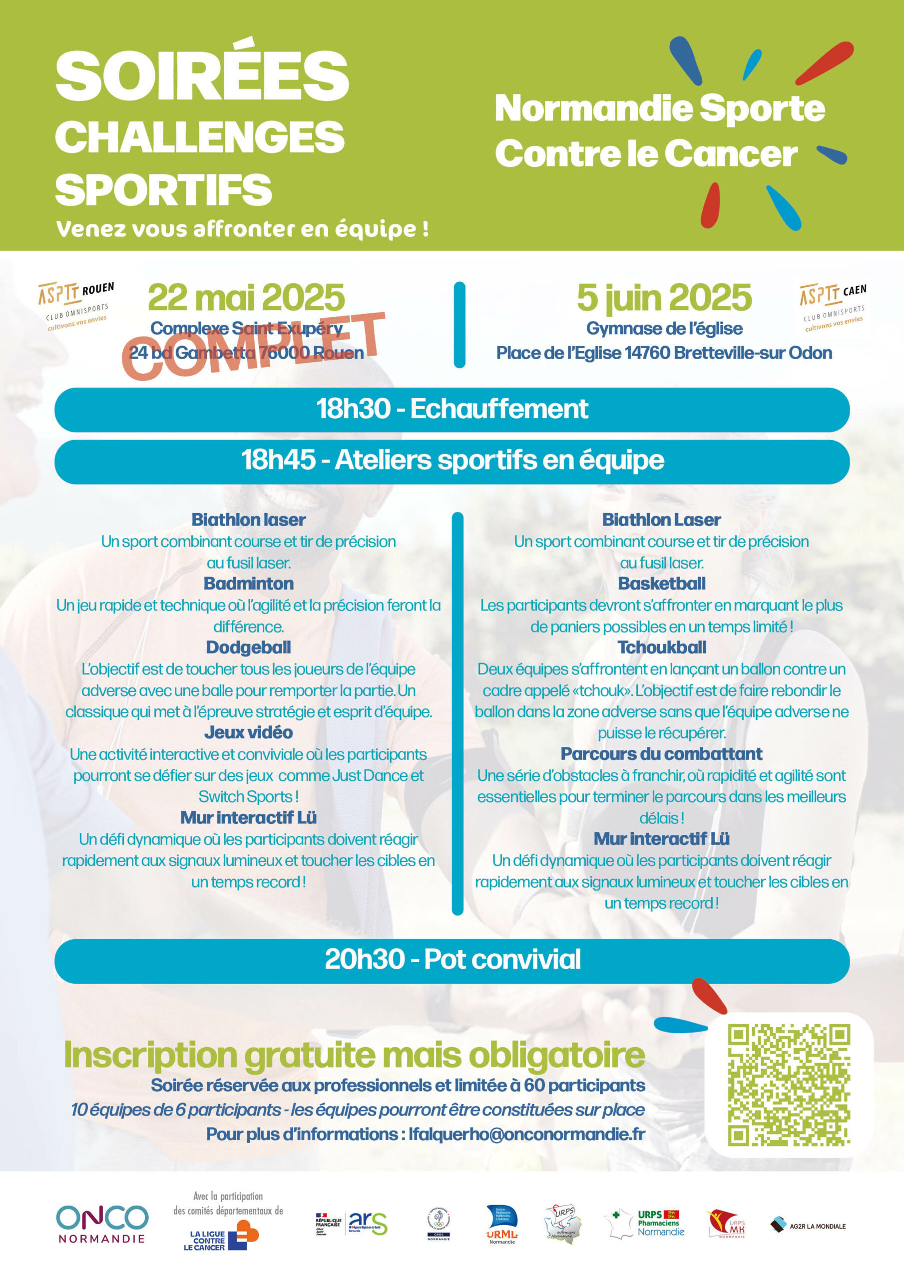 Proposées dans le cadre de Normandie sporte contre le cancer, ces deux soirées seront l’occasion d’échanger, se rencontrer et passer un moment convivial et sportif entre professionnels, structures et associations sportives !