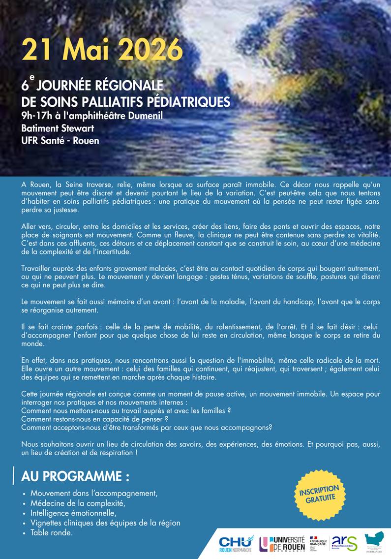 la 6ᵉ Journée Régionale de Soins Palliatifs Pédiatriques Normande organisée par l’ERRSPP du CHU de Rouen se tiendra le 21 mai 2026 à Rouen à l’ UFR Santé de 9h à 17h.