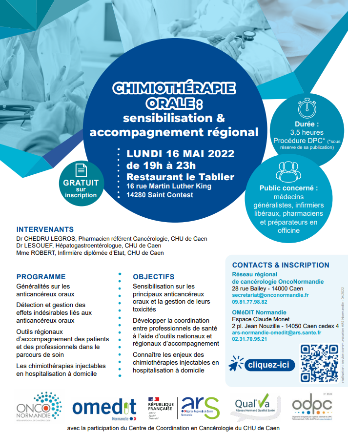 OncoNormandie, Qual’Va et l’OMéDIT Normandie, en partenariat avec l’ARS Normandie et le 3C du CHU de Caen, vous proposent une sensibilisation et un accompagnement régional sur les chimiothérapies orales.