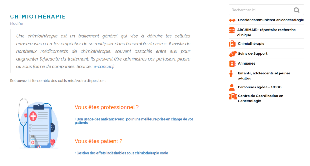 On retrouve dans celle-ci, un onglet professionnel, permettant d’obtenir des informations sur le bon usage des anticancéreux ainsi qu’un onglet patient, mettant à disposition les conseils mis en avant sur le site de l’OMéDIT pour gérer les effets indésirables sous chimiothérapie orale.