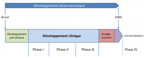 Dans le cadre du développement d’un médicament, le développement clinique vient après le développement pharmaceutique (identification du principe actif et fabrication de la forme pharmaceutique souhaitée) et le développement pré-clinique (détermination des paramètres pharmacologiques et analyses toxicologiques).